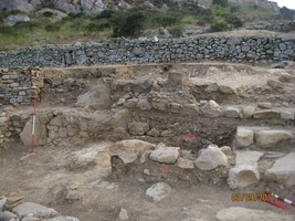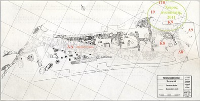 La fouille sur le site de Xombourgo s'est poursuivie en 2011, sous la direction de N. Kourou (université d’Athènes) dans la partie orientale de la terrasse AA et sur la terrasse D, située en contrehaut (carrés K9, I9, I10). Elle a mis en évidence les vestiges épars d’un bâtiment archaïque de construction soignée à l’Est du « sanctuaire pré-cyclopéen » (fig. 1-2).