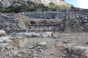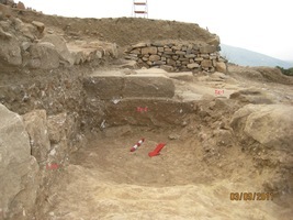 La campagne de 2011 dans le secteur situé en dehors du « sanctuaire Pré-cyclopéen » a poursuivi le dégagement une rangée de pierres appartenant à un escalier maçonné qui semblaient mener du rempart archaïque vers la terrasse E, en contrehaut (fig. 3), sur laquelle était construit un édifice public (E) (cf. Chronique, n. 2068). Une rue pavée de dalles de schistes, bordée par deux murs de soutènement (t.XLVI et t.XLVII) partiellement conservés, menait à cet escalier.