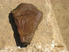 Le dégagement du mur de terrasse Ξ2 a livré de la céramique datant de l’époque géométrique à l’époque classique – dont notamment quelques fragments de pithoi à décor en relief (fig. 7) –, quelques objets métalliques, de nombreux galets, le tout étant mêlé à de la céramique médiévale ce qui signale que la terrasse a été aménagée à une époque ultérieure avec un remblai mélangé.