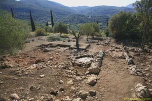 The ca.2.3m-thick peribolos wall ran north-south for some 40m. The peribolos was the latest construction on site, dating ca.1200 BC, at which time a cobbled road was built parallel and to the west of it. This road (ca.2.2m wide) was bordered on the west side by a row of large stones. At a deeper level was a small building of uncertain character, the four metre-long curved wall of which was preserved under the road surface.