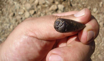 Remains of a large building were found, consisting of a curved wall 1.5m wide and over 10m long, and a straight wall 1.8m wide. The undisturbed stratum (which varied in depth from 0.15-0.6m) sloped to the south and was exposed over an area of ca. 150m2. Finds to date are a curved construction (2m in diameter) which is probably a refuse dump, a round clay hearth, masses of clay, and a small stone cist containing a medium-sized vessel. The stratum contained many sherds of vessels of various shapes, sizes and fabrics, which on an initial reading date to the 14th and 13th centuries (LH IIIB – late Mycenaean period). Terracotta whorls of different shapes and sizes were found with tens of small stone and flint tools, a prismatic steatite bead, and a unique seal-ornament (fig. 2) – a long, droplet-shaped basalt pendant, 0.04m long and 0.0012m in diameter at the mid-point, broken on the suspension end and with a seal image which is hard to read on the curved lower face.