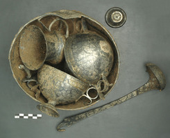 Une fouille de sauvetage au lieu-dit Kouri, en marge de la commune de Foufas, a révélé une occupation au Bronze Ancien, matérialisée par de la céramique façonnée à la main, des lames de silex, quatre bobines et fusaïoles, ainsi que par une fosse contenant de la céramique. Le niveau préhistorique est perturbé par une couche de destruction de l’époque hellénistique et romaine sur une étendue de 100 m2, à laquelle correspondent des pierres et de grands fragments de deux pithoi, ainsi que du mobilier métallique : une attache en fer, cinq clous, deux pointes de lance en fer, trois pesons et un fragment de meule. De cet horizon provient également un ensemble de vases en argent : un canthare, une arytaina et une coupe contenant un canthare portant l’inscription ANTIOXOY et trois skyphoi à anses (fig. 1). Ces vases en argent datent, d’après des parallèles provenant de sites voisins, des IVe-IIIe s. av. J.-C.
