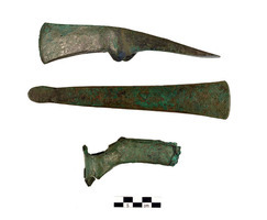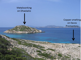 Keros. M. Georgakopoulou (BSA) reports on a study of metal production at Early Bronze Age Keros, focused on finds from the recent excavations. Although Keros appears devoid of ore resources, a small smelting site for both pure and arsenical copper was identified on the Kavos promontory, north of the Special Deposits. Significant evidence for metalworking and metal consumption was recovered from all three settlement phases at Dhaskalio, (Fig. 1) with the great majority coming from the best documented final phase. Frequent copper spills, (Fig. 2) tuyères and some metallurgical ceramics, probably from crucibles and moulds, testify to copper working, and a litharge fragment suggests that cupellation was also practiced. The excavated contexts date to the later Early Bronze Age, when tin-bronze was already known in the Cyclades; yet most copper-based artefacts at Keros were of arsenical copper, with very few tin-bronzes among the analysed finds. (Fig. 3) As at other contemporary sites in the southern Aegean, most copper artefacts are consistent with Cycladic sources, while the tin-bronze is incompatible with an Aegean provenance. The almost total absence of metal from the Special Deposits South and North suggests that despite the metal-rich character of the settlement, metal was not among the ‘prestige’ artefacts deposited on Kavos.