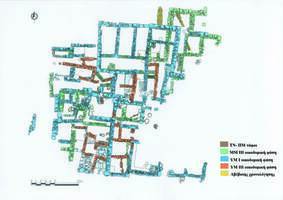The structure, oriented almost north-south, contained 52 rooms and had strong walls of local limestone, with substantial use of mud-brick. Smaller habitation units and areas for religious activities are detected (Figs. 1 and 2). Neopalatial pottery (largely domestic in nature) defined the main use-phase. Substantial reuse in LM III is indicated by later walling. Some Archaic sherds (mostly from pithoi) were recovered. Under the structure, and below a layer of sterile soil, were four Late Neolithic/Early Minoan burials.