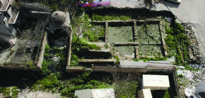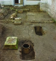 The church of the Ag. Apostoloi, on Kastrinogiannaki Street, was revealed in its entirety in 2009-2010 (the south wall and part of the apse had previously been visible, preserved to a height of 2.5m). This two-aisled church was established in the late 15th or early 16th century AD, and is mentioned as an Orthodox building in the 17th-century sources. Several building phases are observed. The two aisles are joined via three arches supported on orthogonal columns and one half-column on the west wall. The original entrance was in the west part of the north wall, with light coming from at least one window in the south wall. Inside the church were three cist tombs containing co-mingled burials: these must have been visible above the plaster floor. In Ottoman times the building was divided into two. The crudely made walls of a structure (of as yet uncertain function) are preserved in the east part of the church. The remaining area was probably used for storage, with modifications to the church structure including the opening of a window in the south wall: this use is indicated by a large pithos inserted into the north tomb (1) (Fig. 2).