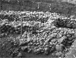 À la phase suivante, Valtos 2, appartiennent trois périboles monumentaux. Le péribole A (larg. 2,40 m), construit en gros moellons sur les deux parements, est conservé sur 4 m de long et sur une seule assise ; il était très probablement circulaire. Le péribole B (larg. 0,80-1 m), circulaire aussi, est conservé sur 22 m de long, 1 m de haut et, sur son côté Est, il est muni de trois alignements perpendiculaires qui pourraient être des contreforts (fig. 1). Le troisième péribole G, conservé sur 8 m de long, est exactement parallèle au précédent, à 1 m de distance à peu près ; il fut rajouté postérieurement du côté Est du péribole B sans doute pour le renforcer ; le péribole G n’a qu’un seul parement (Est) ; il était lui aussi muni d’un alignement perpendiculaire, sans doute un contrefort. Des périboles monumentaux de ce type ont été trouvés à d’autres sites de la région, notamment à Krania d’Hérakleion (v. BCH 127 [2003] Chron., p. 904) et à Pighi Athinas (v. ibid.), mais aussi sur plusieurs sites néolithiques et de l’Âge du Bronze (Néa Nikomédeia, Dimini, Sesklo, Mandalo, Dikili Tash, etc.). Leur fonction exacte (fortification, soutènement, clôture, protection contre les inondations ou autres phénomènes naturels) continue d’être un sujet de discussion. La céramique associée à cette phase (surtout des canthares et des phiales) est caractéristique du milieu et de la fin du BM ainsi que du début du BR en Thessalie (Argissa, Pefkakia).