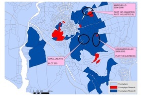 Les nouvelles données rassemblées dans le cadre du programme tendent à montrer que les différents espaces de la ville (domestiques, administratifs, industriels, etc.) n’étaient pas localisés à l’intérieur d’une zone close de remparts mais qu’ils occupaient différents plateaux (Marchello, Mantissa, Evreti, Hadjiabdoulla, Alonia) séparés les uns des autres par d’étroites vallées et des ravins (fig. 1).