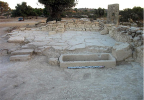 Dans le reste du bâtiment, cinq pièces ont été explorées. L’une d’entre elles servait sans doute d’étable pour les ânes ou les mules : la pierre d’angle de la pièce portait deux trous qui devaient servir à attacher les animaux. Parmi les trouvailles provenant des autres pièces, mentionnons un bloc de pierre rectangulaire avec un grand « A » gravé, une épingle en bronze à tête arrondie et deux monnaies de cuivre de Constance II (337-361). Ces données confirment l’hypothèse que la dernière phase du sanctuaire date des environs de 365 apr. J.-C., moment du grand tremblement de terre qui a détruit la ville voisine de Kourion.