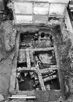 Parmi les structures identifiables, on signale une fontaine constituée d’un bassin rectangulaire et d’un bassin circulaire surmontés par un arc qui remploie plusieurs blocs sculptés : une imposte portant une croix sur deux faces, deux fragments de dalle de marbre des XIIe-XIIIe s., ainsi qu’un fragment d’encadrement de porte sculpté. La fontaine était reliée à une canalisation de terre cuite dont une partie est conservée.