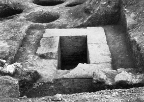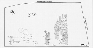 La thékè (long. 3,18 ; larg. 2,18 m ; fig. 2) était creusée dans la roche et les parois étaient revêtues de blocs de poros assemblés selon le système isodome. Aucune trace d’une couverture n’a été localisée. Le mobilier à l’intérieur de la structure et dans ses couches inférieures compte un fragment de périrrhantérion en marbre, un stylet en os, une pointe de lance en fer et un poignard en bronze. Les couches supérieures étaient perturbées, mais comportaient du mobilier : un fragment sculpté en poros représentant un sphinx, un élément architectural en poros, un périrrhantérion en marbre, un bord de pithos inscrit (peut-être du Ve s. av. J.-C.), et de nombreuses tuiles.