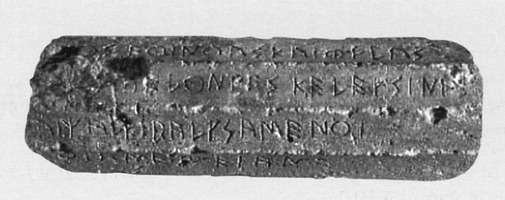 Parmi les trouvailles les plus importantes figurent quatre lamelles de bronze inscrites, dont trois sont opisthographes. Les textes (entre 4 et 12 lignes) sont datés du début de l’époque classique. On signale aussi une colonnette en poros dont les cannelures comportent une inscription de quatre lignes, datée de l’époque archaïque (fig. 3). Le texte, très lacunaire, semble se rapporter aux événements de l’année 506 rapportés par Hérodote (V, 77) (cf. ABSA 101 [2006], p. 369-377).