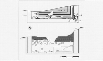Une canalisation a été trouvée au Sud-Ouest de ces constructions, de même que d’autres vestiges épars de murs.