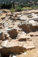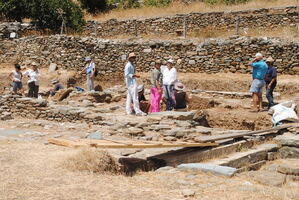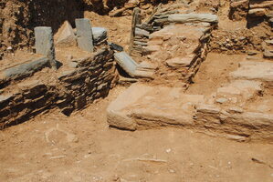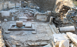 La fouille a également apporté de nouvelles informations sur le bâtiment à cour péristyle déjà partiellement exploré, dont trois états de construction ont pu être identifiés. L’enlèvement de la première berme a permis de dégager l’angle Sud-Ouest du bâtiment. Le dégagement de la seconde a mis au jour l’angle Sud-Est du stylobate de la cour. La découverte d’une monnaie de bronze de la cité d’Andros du IIIe s. av. J.-C., trouvée en contact avec les fondations, confirme que le stylobate, appartenant au troisième état, a probablement été construit au début du IIe s. av. J.-C. Le mur perpendiculaire au stylobate, détruit lors de la construction des fondations de celui-ci, appartient à un état antérieur du bâtiment, remontant certainement au IIIe s. av. J.-C. On a trouvé dans ce secteur des restes sacrificiels, probablement liés à un rituel de consécration du bâtiment – la même pratique avait déjà été observée en rapport avec le portique hellénistique. Sur toute la surface explorée au dessous de la couche de déchets de taille liée à la construction de la cour péristyle, on a trouvé quatre foyers, fondés sur des masses de briques crues, avec des fragments de moules en argile et des vestiges de fonte de métal. Sous le stylobate lui-même, on a dégagé une fosse de coulée. Ces éléments confirment que les vestiges du travail du métal, également observés au cours des campagnes précédentes à l’intérieur du bâtiment, sont liés à son état le plus ancien, daté de la fin de l’époque classique.