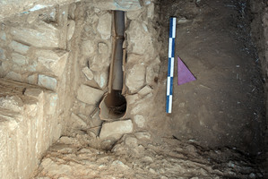 On a poursuivi la fouille d’un espace orthogonal (fig. 6-7), qui, vers le Sud, a détruit le mur Nord de la basilique. Cet espace, soigneusement construit en blocs de schiste taillés, est relié à un sol dallé au Nord (fig. 6). On lui associe également une canalisation en terre cuite à l’Est, en forme de Π renversé, couverte de dalles dans un premier temps. Cette canalisation se dirigeait vers le Nord, aboutissant à un petit réservoir formé par une panse d’amphore en argile (fig. 8). Aux parois internes des trois murs conservés de l’espace orthogonal sont encore attachés, par endroit, des fragments d’enduits appartenant à deux phases, de couleur blanche et bleu-vert (fig. 7). Cette structure paraît être liée à une fontaine qui se trouvait à l’arrière du portique hellénistique.