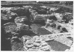 In its first phase of use, the bath consisted of the three western rooms: the apsidal room was a later addition requiring the relocation of the east wall of the older caldarium (part of that wall and the floor were built into the floor of the new wing). The east rooms of the tepidarium and the frigidarium were likely also added at this time. The wall construction and the only two coins yet to prove legible support a provisional Early Christian (fourth- to fifth-century) date for the complex.