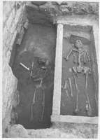 Fill from across the interior of the church and from the perimeter trenches contained a number of reburied and scattered bones. A free burial was found in the north transept in a hole in the terracotta floor. The area around the outside of the church was freely used as a cemetery. In addition to the graves found in 2003, a free burial and a cist grave were found on the east side of the church just north of the narthex. The cist grave was a Hellenistic construction re-used for burials and reburial of bones during the Late Byzantine period (as confirmed by glazed pottery and two tornese coins found inside it). Finds from the excavation in general date from Late Byzantine times onwards, rather than from the first phase of the monument.