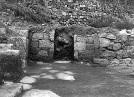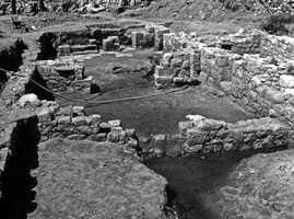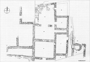 À l’Ouest de la ruelle, douze espaces, répartis en trois ensembles parallèles d’Orientation Nord-Sud, ont été mis au jour. Des fouilles furent menées de manière systématique dans les pièces Α, Β, Η, Θ, Ζ, Γ. La pièce A (5 x 6 m) ouvrait vers le Sud sur une autre pièce située en dehors des limites de la fouille. La pièce B (4 x 6 m) ouvrait à l’Est vers un espace étroit (0,75 x 3,20 m) situé entre les pièces Ζ et Γ, et au Nord vers l’espace H, via un large accès doté d’un arc en plein-cintre (2 m). Celui-ci était formé par des claveaux en pierre volcanique locale poreuse et de couleur verdâtre, probablement choisie pour son poids réduit (fig. 4-5). L’accès situé dans la partie Est du même mur est interprété comme une modification ultérieure. Un four à chaux occupait pratiquement tout l’espace de cette pièce. La pièce H (6 x 5,60/6,60 m) disposait au Sud-Est d’un accès vers la pièce Z et au Nord-Est d’un autre accès doté d’un arc en plein-cintre, vers la pièce Θ. Le sol présentait encore le revêtement initial en dalles de schiste dans la partie nord de la pièce. De ce côté, les restes d’un escalier qui menait vraisemblablement à une pièce située au Nord ont été découverts. Le long du mur Ouest, les vestiges d’une structure quadrangulaire ont été mis au jour. À l’Est des pièces A, B et H, les pièces Θ, Ζ et Γ ont été en partie explorées. Les pièces Θ (3,80 x 3,30 m) et Ζ (3,30 x 3,20 m) communiquaient à l’Ouest avec la pièce H, tandis que la pièce Γ (6 x 3,20 m) était uniquement accessible par la ruelle. Au Sud de cette dernière, une partie d’un autre espace, Δ, a également été mise au jour.