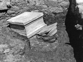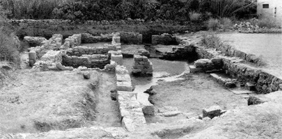 Les murs de l’édifice étaient réalisés en maçonnerie de pierres sèches. Certains portaient encore les restes de l’enduit qui en couvrait les parements. Des fragments d’opus tesselatum et d’enduits peints complètent le matériel architectural découvert. Le matériel céramique mis au jour était principalement daté des Ve et VIIe s. apr. J.-C., mais les fouilleurs ont également noté la présence de tessons classiques, hellénistiques et romains, voire même quelques-uns archaïques. Toutefois, on suppose que l’édifice n’est pas antérieur à la fin de l’époque hellénistique ou au début de l’époque romaine. Il aurait été érigé à cette période pour être ensuite modifié à l’époque protobyzantine. On remarque, par ailleurs, que des fragments de marbre principalement découverts dans les pièces A et H étaient vraisemblablement liés à la présence du four à chaux de la pièce B. Une base en marbre carrée (0,82 x 0,82 m), mise au jour dans la pièce A (fig. 6), est identique à quatre exemplaires trouvés à proximité et conservés au musée. Aucune conclusion définitive n’a pu être émise au sujet de la vocation de l’édifice, mais les fouilleurs doutent qu’il s’agissait d’une maison. L’emplacement de cette structure indique en tout cas que la ville et le port antique de Milos s’étendaient jusqu’au rivage de l’île.