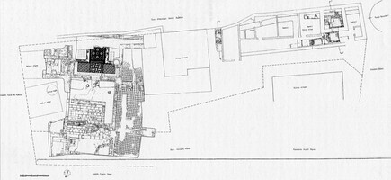 Dans la partie Ouest du terrain, on note la présence d’une série de marbres antiques, dont un élément représentant un sphinx dressé vers la droite, remployés dans des constructions des années 70, explorées par la XXIIe éphorie des antiquités préhistoriques et classiques, et par la 4e éphorie des antiquités byzantines. Des vestiges architecturaux datés du IIe au VIIe s. apr. J.-C. ont également été découverts au cours de sondages à l’intérieur des pièces de ces constructions. À l’intérieur de l’une de ces pièces, sont apparus les vestiges du stylobate d’un péristyle et son impluvium, datés de l’époque romaine tardive.