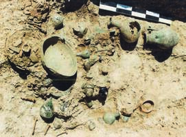 The Rom cemetery lies on a low mound ca. 100m W of the settlement. The following tombs were investigated. Tomb 1: lined with terracotta slabs; contained a 1st Ct AD skyphos. Tomb 2: tile grave, with one burial, containing a glass amphoriskos. Tomb 3: tile grave with one bronze coin of Claudius (41−54 AD) placed by the lower jaw of the deceased. Tomb 4: disturbed tile grave, with a poorly preserved skeleton, a terracotta lamp, a tear-bottle and an amphoriskos. Tomb 5: tile grave containing a glass tear-bottle and a broken pottery vessel. Tomb 6: poorly preserved skeleton with sherds of one vessel. Tomb 7: pit grave, 2.2m x 0.8m, containing one female burial in extended, prone position but with iron nails indicating a wooden bier.