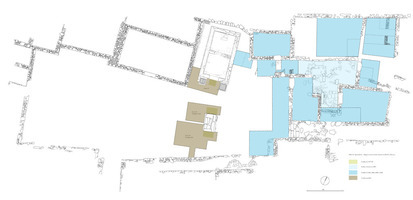 Fig. 1/ Délos, l'Aprhodision de Stèsiléôs, plan des vestiges. Les sondages de 2012 sont représentés en marron (en bleu sont représentés les travaux menés de 2005 à 2010).
