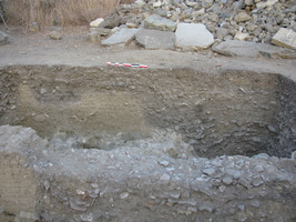 Sous le remblai de surélévation, le sol de la première occupation du sanctuaire était très bien conservé. Là encore, il venait clairement buter contre l’assise de réglage du premier état de l’autel. Il était lui aussi coupé par plusieurs fosses contenant une grande quantité d’os et de céramiques dans une terre très cendreuse : c’étaient très probablement aussi des dépotoirs de sacrifice.