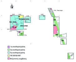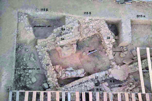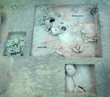 At the northwest corner of Building Δ was an extensive clay floor with strong traces of burning; three large stone bases with tenons on their upper surfaces were set on the transverse axis of the building, with two smaller stone bases in between and a third to the north of the west end. The smaller bases were set lower and probably partially covered by the clay floor. The area was likely central courtyard, with a stoa on the south and west sides. The roof was supported with built piers and wooden columns (Fig. 2). On the clay floor were large fragments of a mortar and pebble floor from the collapsed upper storey. The area was destroyed by fire in LH IIIB Early, with a re-use phase in LH IIIB-IIIC. Building remains identified below these probably belong to the west long side of Building Δ, and suggest the existence of two older, LH IIIA, building phases (Fig. 3). Remains of Byzantine (ninth- to tenth- century) habitation were also found here. In the northwest corner of the excavated area, within the upper Byzantine layer, was a fragment of a Linear B tablet, the sixth from Agios Vasileios, preserving the symbol of the double axe.