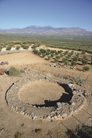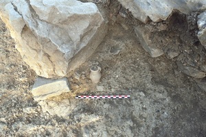 Cleaning in the cemetery and sanctuary areas permitted digital recording of the architectural remains (Fig. 5). Cleaning of the entrance of tholos tomb E confirmed the accuracy of Xanthoudidis’ plan. Cleaning of the west section of the wall of tholos tomb B revealed a large number of small finds including a prepalatial stone seal, a theriomorphic ivory pendant, pieces of stone vessels, stone counters, pebbles of various forms and one gold ring-shaped counter.