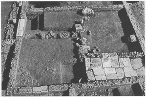 In Section A, a stone-built complex was erected in the fourth century BC and remained in use until Late Hellenistic times, with a later building phase dating to the first century BC-first century AD (Figs 1: 4α; 2-3). The rooms are tightly packed, with some walls re-used in the second phase and others then added (using spolia) – one paved floor of the second phase included inscribed grave stelai. A purple dye workshop may have operated in room 2, where much shell was found: a neighbouring cistern lined with hydraulic cement probably served the workshop. The eastern part of the complex was built in the second phase and itself shows two phases between the first century BC and the third century AD. In this final phase, a well-constructed, brick-built building had rectangular rooms planned in wings around a central courtyard with a well. Certain rooms were workshops. Room 4 in the east wing contained a large stone crushing basin (probably from an olive press to judge from the quantity of olive pits found), with associated storerooms containing pithoi to the north, and to the south in room 6, a hearth which may have provided the hot water required for the separation process (Fig. 4). Two wine presses were found in the south part of the complex (belonging to the successive construction phases) (Fig. 5). Finds from Section A include limestone columns and other architectural remains, many silver and bronze coins (including many issues of Nikopolis), and a hoard of bronze vessels, coins and a statuette of a dancing satyr concealed in one room (Fig. 6).