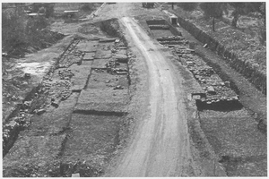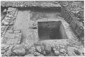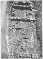 In section Γ, an ancient road was found with an extensive building complex (probably a farmhouse) along its south side, partially excavated on either side of the modern road (Figs 1: 4γ; 7-8). The ancient road ran almost parallel to the modern, with a retaining wall on the north side (pottery from the foundation dates to the late fifth and fourth century). The building complex had three construction phases, the earliest of which (dating to the Late Classical-Hellenistic period) was represented by just one stretch of wall. Three rooms of phase 2 were traced, dating from the first century BC to the second century AD, with much earlier building material reused. During this phase the building contained an olive press (part of the press-stone was preserved, also part of the press for olive paste and a nearby pit containing many olive pits) (Fig. 9). This activity probably continued into the third phase of the complex, which lasted to the third century AD. At the southwest corner of the complex were five tile graves without goods. One further ancient grave, probably to be linked with the first construction phase, was found during the opening of a storm drain at the junction of Philosophon and Anapauseos Streets, slightly to the north of the building complex in an area where a cist grave had previously been found (see ADelt 33 [1978] Chr. 182).