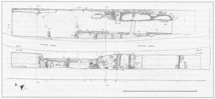 In Section B, very slight building remains were located – a dense destruction deposit with much tile, with traces of wall beneath (Fig. 1: 4β). A small part of a second building was found 22m to the east. Between these buildings were two tombs. One was a cist grave containing two burials with ceramic vessels, plus a cremation in an Ambracian black-glazed amphora of the late fourth to first half third century BC (of a type manufactured for this purpose), which also contained one or two iron strigils: a terracotta lamp and evidence of burning over the tomb cover indicate offerings to the dead. The second was a tile-covered cist grave which also contained two burials and ceramic vessels. The discovery of a stele inscribed just with the letter Π (for παϊς, following local custom) indicates a child burial in one of the tombs.
