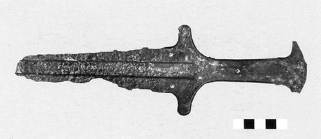 Dans la région du village du Kastaniotissa, au Nord de l’Eubée, la XIe éphorie des antiquités préhistoriques et classiques signale la découverte fortuite d’une épée mycénienne en bronze (long. conservée 0,27 m ; fig. 1). Elle appartient au type « Dii » selon la classification de N. K. Sandars (dans AJA 67 [1963], p.117-153) ou au type 2 des épées en croix d’après celle de I. Kilian-Dirlmeier (dans PBF IV, t. 12 [1993], p. 63) ; elle date de l’HR IIIC.