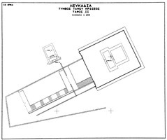 En 2004, au cours de travaux de réfection de l’accès à la tombe du Jugement, une nouvelle tombe macédonienne a été découverte à quelques mètres au Nord de la paroi Nord du dromos de la première (fig. 1). La nouvelle tombe, à deux chambres (6,50 x 4,10 m) et toiture voûtée, appartenait peut-être au même tumulus que la tombe du Jugement (dans ce cas le diamètre du tumulus était au moins de 50 m). Sa façade est d’ordre ionique avec deux demi-colonnes de part et d’autre de la porte d’entrée (fig. 2). Le fait que la façade déborde des parois du monument et qu’elle ne lui est donc pas liée de façon organique, pourrait indiquer que le monument est antérieur à ceux du même type dont la façade s’intègre totalement aux contours du bâtiment. D’après le mobilier funéraire (vases, collier en or, coquillages provenant sans doute d’une boîte à fard, fils de tissu en or, fragments d’outils en fer) la tombe date de la fin du IVe ou du début du IIIe s. av. J.-C.