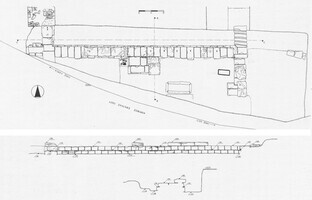 La construction (l. 19,15 m ; larg. 6,70 m), faite de blocs de poros taillés, présentait un plan en H. Le niveau de fondation de la structure est conservé, ainsi que la première assise de l’élévation et quelques blocs de la seconde. Sept sépultures ont été fouillées à l’intérieur de l’enclos : deux tombes à tuile, deux inhumations simples (dont une sépulture féminine comportant une pyxide, une fibule en bronze, de la céramique de type West Slope et des fragments de figurine du type de l’Herculanaise) et trois tombes à ciste. L’une de ces dernières, de petite dimension (l. 0,97 m ; larg. 0,30 m), comportait la sépulture d’un enfant accompagné de figurines. Une autre comportait deux sépultures, celles d’un homme et d’une femme, datées respectivement de la fin du IVe ou du début du IIIe s. av. J.-C. et du deuxième quart du IIIe s. av. J.-C. Une autre tombe à ciste identique à celle-ci, accolée à sa paroi Nord, n’a pas été fouillée. Deux autres tombes ont été dégagées à l’extérieur, une à l’Ouest et l’autre à l’Est de l’enclos.