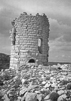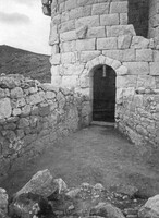 On a dégagé un grand nombre de blocs parfaitement taillés. À l’intérieur de la tour, on a atteint le sol en terre ; au bas de la porte arquée, on a mis au jour un escalier qui menait vers le niveau inférieur. La fouille contre le rempart a permis de dégager le parement interne et les fondations reposant sur le rocher.