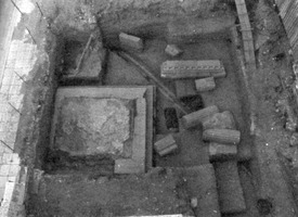 Sur le côté Sud du terrain, on a mis au jour des blocs de marbre, scellés entre eux par des crampons en plomb et reposant sur une assise de réglage en pierre locale. La structure ainsi délimitée (dimensions 4,25 x 3,25 m) doit probablement être identifiée à la base monumentale d’une statue ou d’un groupe sculpté. La comparaison avec des bases similaires mises au jour à Priène et datant du IIIe s. av. J.-C. permet de situer le monument à l’époque hellénistique.