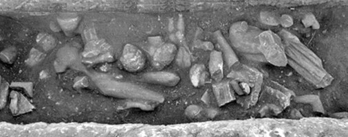 La fouille a mis au jour un creusement allongé dans la roche (long. 20 m ; larg. 0,41-0,73 m ; prof. 1,90-2,16 m), probablement aménagé pour évacuer les eaux de pluie. À l’intérieur ont été découverts un grand nombre de fragments de statues, dont certains correspondent aux fragments qui avaient été remis à l’éphorie (fig. 1). On a identifié des fragments de statues d’Apollon et de quelques autres divinités, mais aussi des figures d’enfants, ainsi que des fragments de statues colossales, notamment la tête et les pieds d’un Asclépios. Le remblai qui entourait ce dépôt comportait très peu de céramique commune de l’époque romaine. Les statues datent pour la plupart du début de l’époque hellénistique, sauf un fragment de kouros vêtu portant une dédicace à Apollon de l’époque archaïque.