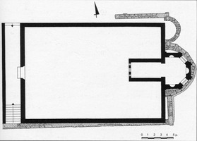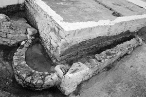 Au Sud de l’île de Kalymnos, à Pothia, M. Koutellas (4e éphorie des antiquités byzantines) a effectué en 2003 des sondages sur l’église protobyzantine au-dessus de laquelle a été construite une école primaire (Scholi tou Maurou-Euaggelistria ; fig. 1-2). Il s’agit d’une basilique à trois nefs et deux absides à l’Est. Un sondage sur le côté Sud de la basilique a fait apparaître ses fondations. Un sondage au Sud-Est, entre la nef Sud et le mur Est de l’école, a permis de mettre au jour le sol de la nef Sud, constitué de dalles de terre cuite, de petites pierres et de mortier. Enfin, un sondage au Nord de la basilique a livré le seul élément architectural sculpté : une imposte de double colonnette provenant d’une fenêtre, représentant une croix inscrite dans un cercle. Ces travaux ont permis de déterminer la largeur de l’édifice, qui est de 17,35 m, tandis que sa longueur n’a pu être précisée (environ 28 m).