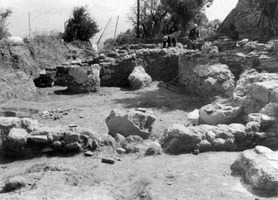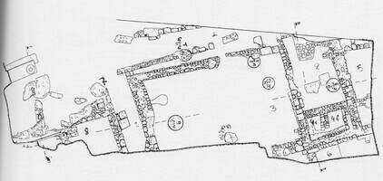 On a dégagé les vestiges de deux bâtiments séparés par une rue orientée approximativement Nord-Sud. Le bâtiment Nord-Est est composé de trois petites pièces. Le bâtiment Nord-Ouest est composé d’une grande pièce, probablement hypèthre, et de plusieurs pièces plus petites. On a dégagé six pithoi, dont trois ont été trouvés dans l’espace hypèthre : tous étaient détruits au niveau de la moitié de la panse. Un exemplaire contenait des fragments d’amphore, une tige en bronze, et d’autres tessons de céramique. On a identifié deux citernes, une dans chaque bâtiment ; l’une avait des parois revêtues de mortier hydraulique, l’autre un sol de galets revêtu de mortier.