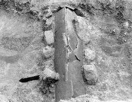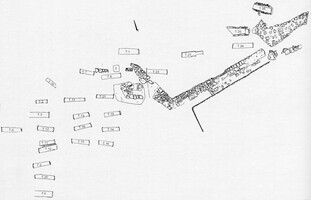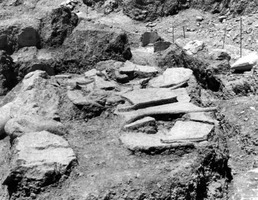 Dans l’ensemble, les tombes ne comportaient pas de mobilier, mais on a recueilli, à l’extérieur, des tessons de céramique. Dans la partie orientale du terrain, la fouille a fait apparaître des vestiges de murs en mauvais état, qui semblent constituer le péribole de la nécropole. Au centre de la nécropole, entre un mur Nord-Sud et la tombe 21, on a dégagé une structure maçonnée, à l’intérieur de laquelle une importante quantité de tessons de céramique a été recueillie : on suppose que des banquets funéraires pourraient s’être tenus à cet endroit.