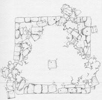 La tour Ouest (fig. 2), de plan carré (8 m de côté), était construite en appareil pseudo-isodome, conservé sur une hauteur de 10 assises (5 m). Elle comportait manifestement un étage, à en juger par les ouvertures de 0,15-0,20 m de large observées sur tout le pourtour de la construction. Deux ouvertures larges de 1 m ont par ailleurs été observées au niveau inférieur des côtés Sud et Est. Au Sud de la tour, on a identifié plusieurs murs qui pourraient avoir appartenu à une cour ou à des bâtiments annexes. La découverte d’une citerne, d’une meule en pierre, ainsi que d’une grande quantité de céramique commune de l’époque hellénistique suggère que la tour s’insérait dans un système de défense d’une installation agricole de la chora de Nisyros.