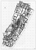 Les fouilles ont été effectuées au Sud et surtout à l’Est de la rue Nord-Sud et de son mur d’analemma. On a mis au jour six bâtiments en tout, l’un au Sud (bâtiment V) et les autres à l’Est (bâtiments VI-X) (fig. 1). On n’a pu repérer leurs limites Est, qui doivent se trouver à l’Est du chemin aménagé pour la visite. Les bâtiments sont contigus, séparés par des murs mitoyens, ce qui indique qu’ils furent construits en même temps, lors de la réorganisation de la ville au début du IIe s. apr. J.-C. La fonction de ces bâtiments, dont le plan n’est pas régulier, n’est pas toujours claire ; leur caractère domestique semble associé, dans certains cas, à une fonction commerciale ou artisanale. Toutefois, à l’exception du bâtiment VII qui semble avoir un caractère public (citerne circulaire), les autres sont plutôt des habitations particulières. La découverte de deux tombes à l’intérieur du bâtiment V (côté Sud) confirme qu’après sa destruction l’habitat fut utilisé comme cimetière.