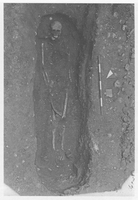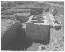 The remaining tombs outside the monument comprise pit graves (5, 6, 8, 9 and 11), one cist (4) and one sarcophagus (7). Grave goods usually consisted of a high-footed skyphos, a miniature lamp, a miniature oinochoe or unguentarium, and occasionally a strigil and eggshell. A long shallow east-west channel may have been the original passage into the cemetery: close to its west end was a burnt layer containing carbonised material.