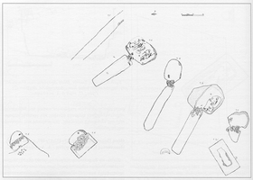 Dragatsoula (km marker 17+359-17+376: former Dousladzi property). Thirteen further fifth-century pit graves were found (all undisturbed), raising the total to 21. The new tombs 9-21 were pits opened in the bedrock, in two cases (11 and 17) covered with stone slabs. They were oriented east-west or north-south, and contained the inhumations of adults, women and youths, both highly contracted and extended. They contained one or more offering inside and over the grave. Offerings include red-figure lekythoi with women’s scenes, white-ground lekythoi with plant motifs, squat lekythoi, lekanides, skyphoi, kanthariskoi, phiales, small oinochoae, miniature amphorae, terracotta figurines (males, females, ‘temple boys’, satyrs, horses and riders, and birds), bronze and iron strigils, bronze rings, bronze mirror discs and a bronze spatula. The cemetery was defined on the south/southwest by a retaining wall.