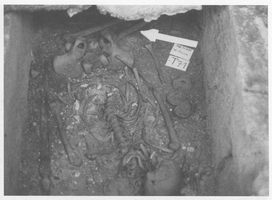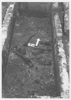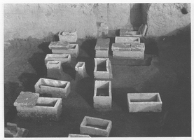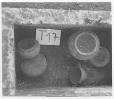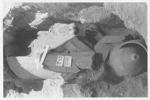 Rota property (km marker 0+200). Seventy-three tombs were found in continuing excavation of the area of the Geometric cemetery. No consistent orientation was observed. They comprised: 58 Roman tile graves, some containing ceramic and glass lachrymateria and bronze coins (the rock-cut foundation of a funerary monument and two enchytrismoi also date to this period); seven pit graves and six larnakes (all but three covered with stone slabs) of the ninth century BC. Two larnakes had grave markers on the south side: to the south of the marker was an offering trench. Of the total of 73 graves, 35 contained no goods, while the rest had oinochoae, aryballoi, amphorae, skyphoi, bronze rings, gold earrings, a sword and an iron dagger,