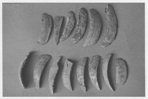 Tomb 2 (LHIIIB: dromos 6.9m long, 0.8-1.1m wide; oval chamber 2.5x3.65m). The collapsed chamber contained in the centre a disturbed adult inhumation with a bronze spearhead and knife, and (by the head) 23 tusks. To the north were the displaced bones of a further burial with five tusks (indicating that all the tusks were originally deposited with this burial). The remains of two further displaced burials were collected on the south and west sides of the chamber. Sherds of a stirrup jar were also found.