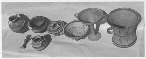 Tomb 5 (LHIIIC-Submycenaean: the dromos is preserved for a length of 7.5m but continues beneath a modern road; rectangular chamber 2.3x3m). The dromos contained an empty cist grave; three pieces of bronze spirals were also found. The chamber, which had collapsed by Early Byzantine times (it contained a Byzantine millstone), held six adult inhumations. The remains of burial 1 (with an alabastron) were gathered in the northeast corner. Burial 2, on the south side, had an LHIIIC Late lekythos and skyphos. Burial 3, of a woman, had an LHIIIC Late-Submycenaean skyphos, a small handmade burnished prochous and a bronze pin. Burials 4-6 followed in sequence south from burial 3. Burial 4 had a conical button, and 5 and 6 no goods.