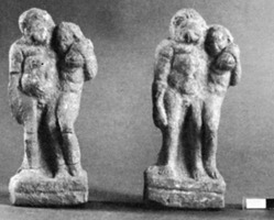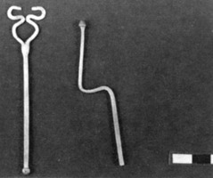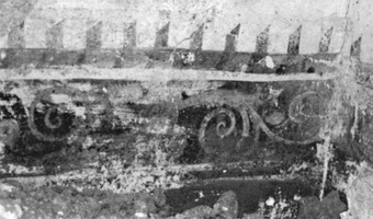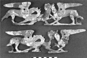 On souligne l’intérêt particulier d’une grande tombe à ciste (2,50 x 1,70 m) dont les parois intérieures portaient un décor polychrome sur plusieurs registres ; le registre principal portait un décor floral (fig. 1). Des plaquettes en ivoire et des groupes d’aigles-griffons déchiquetant un cerf en terre cuite dorée, proviennent du décor du lit en bois (fig. 2) ; dans la même tombe on a aussi recueilli un strigile en fer doré, un canthare en argent, de nombreux bijoux en or et en bronze, dont une couronne de myrte en or, des boutons dorés à protomé d’Athéna en relief, un poignard et un statère en or de Philippe II. Parmi le mobilier des autres tombes on retiendra : deux figurines jumelles représentant un groupe d’Héraklès avec un serviteur (fig. 3) trouvées dans une tombe d’enfant ; un caducée miniature en argent et une petite clé, en argent aussi, du type dit « homérique » (fig. 4).