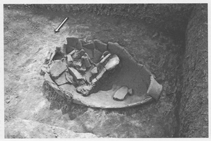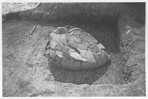 Soudeneika (Argyropoulou-Kaouri property). A. Vasilogamvrou (Στ’ ΕΠΚΑ) reports the discovery of a Geometric pithos burial and a pit grave to the west of the road to Arla. The pithos, found shattered, contained bone and a bronze ring. Ca 7.8m to the south, at a higher level, was an extended, supine inhumation without goods in a simple pit. Between the two burials was a concentration of stones.