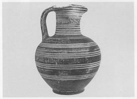 Kato Potamia, Erimo Chorio. E.-I. Kolia (Στ’ ΕΠΚΑ) reports the discovery of a Late Geometric pithos burial south of the road to Kato Potamia. The pithos (1.3m tall) contained a supine inhumation with two oinochoae, a kantharos, an askos, an iron dagger and spearhead, and a bronze ring. It was closed with a sherd of another pithos.